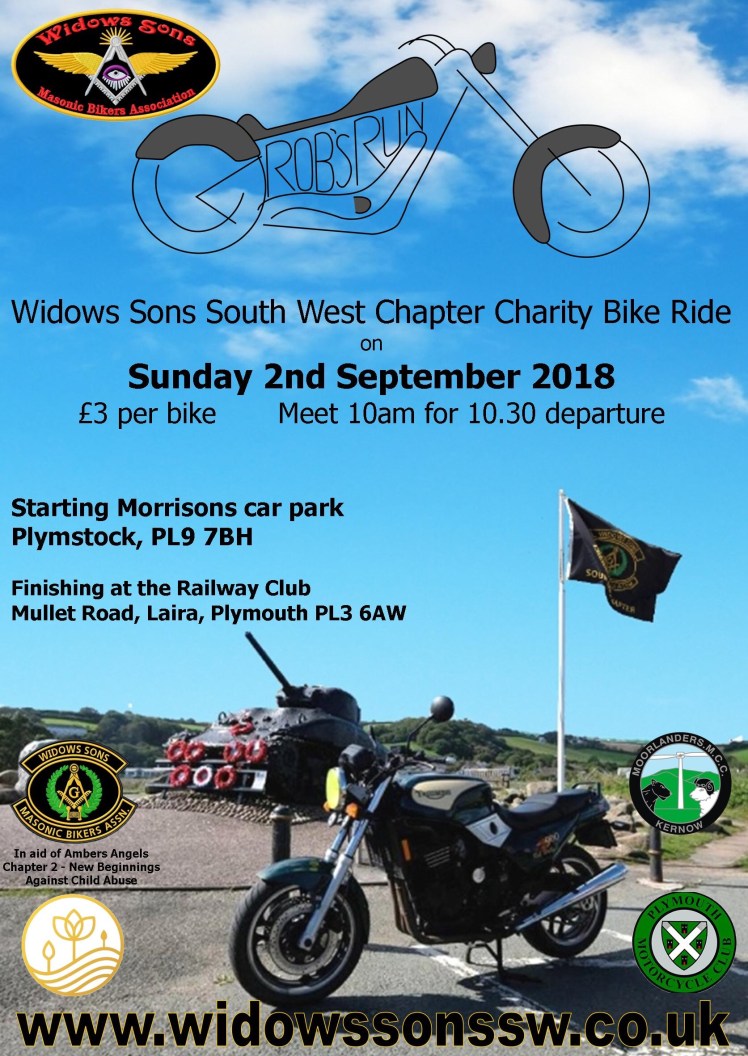 In September 2015 Widows Sons masonic bikers held the first Rob’s Run in Plymouth, Devon. This annual event was named in honour of our late Vice President, and Founder Member, Rob Walls.